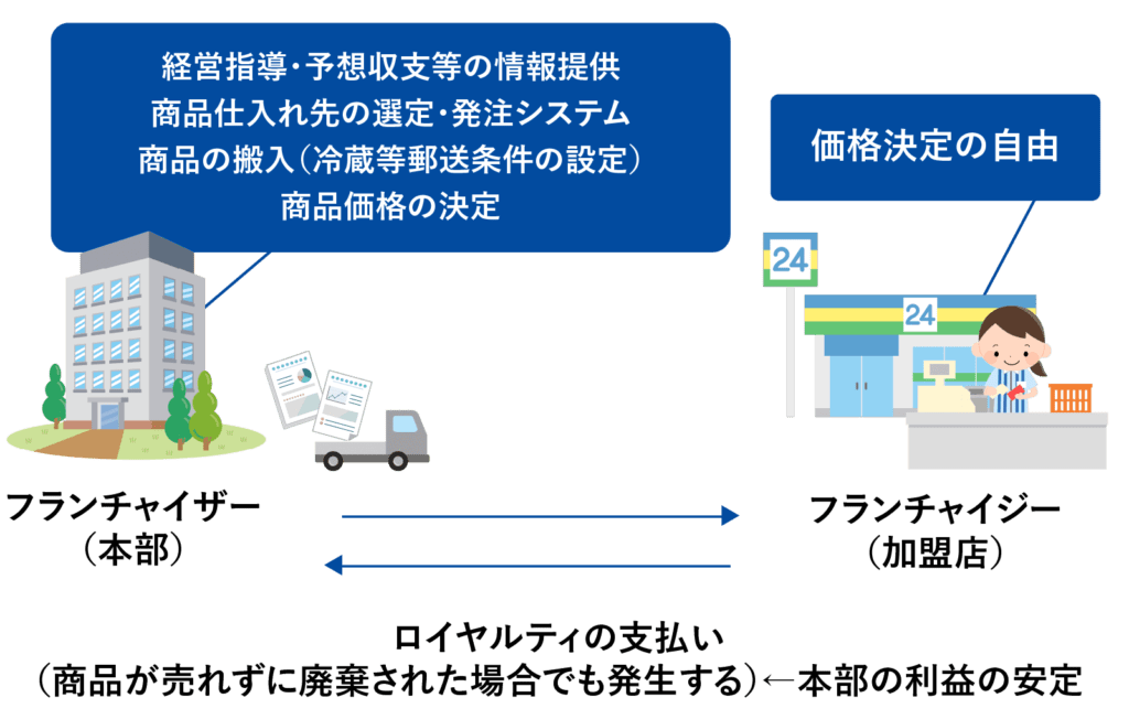 フランチャイザー(本部)とフランチャイジー(加盟者)からなるフランチャイズ·システムは、コンビニエンスストアや飲食店を中心に普及しています。